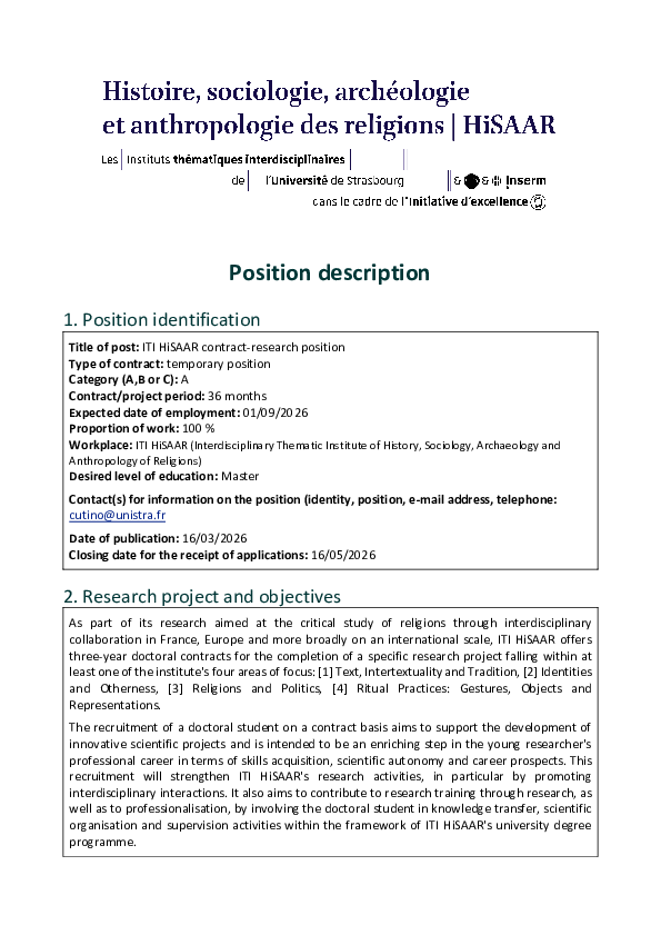 Dans le cadre de ses recherches dont l’objectif est l’étude critique des religions par une collaboration interdisciplinaire française, européenne et plus largement internationale, l'ITI HiSAAR met au concours au fil de l’année 2026 des contrats d'une année avec une thématique définie, s'inscrivant dans au moins l'un des quatre axes de recherche : [1] Texte, intertextualité et tradition, [2] Identités et altérités, [3] Religions et politique, [4] Pratiques rituelles : gestes, objets et représentations.